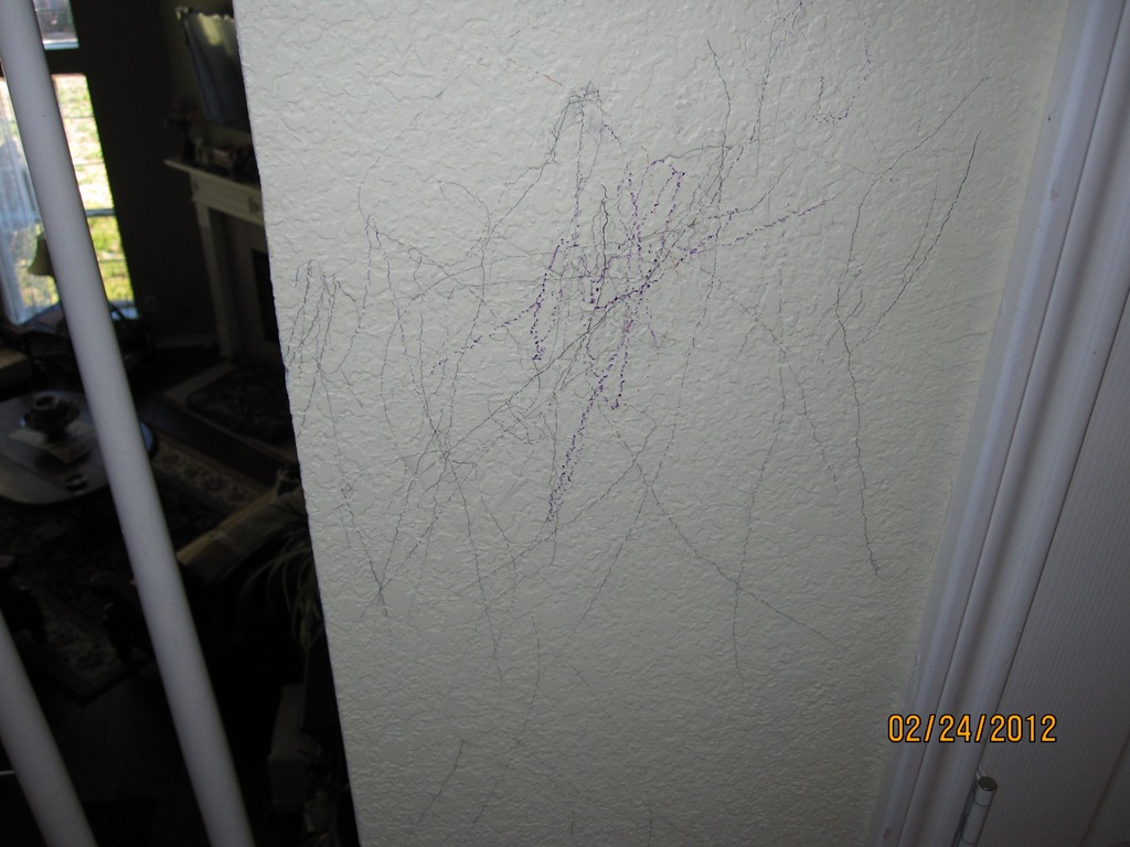 Jenny and I had decided years ago that there’s no point in buying expensive stuff while we have babies and toddlers running around, spilling juice, throwing up, and coloring on every imaginable surface.  We do our best to train them in good manners and proper etiquette, but we still manage to find artistic surprises all over the house.