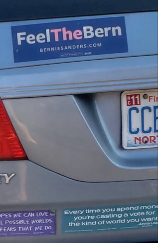 One reads: FeelTheBern, supporting the socialist tyrant Bernie Sanders. The other reads: Every time you spend money you’re casting a vote for the kind of world you want.