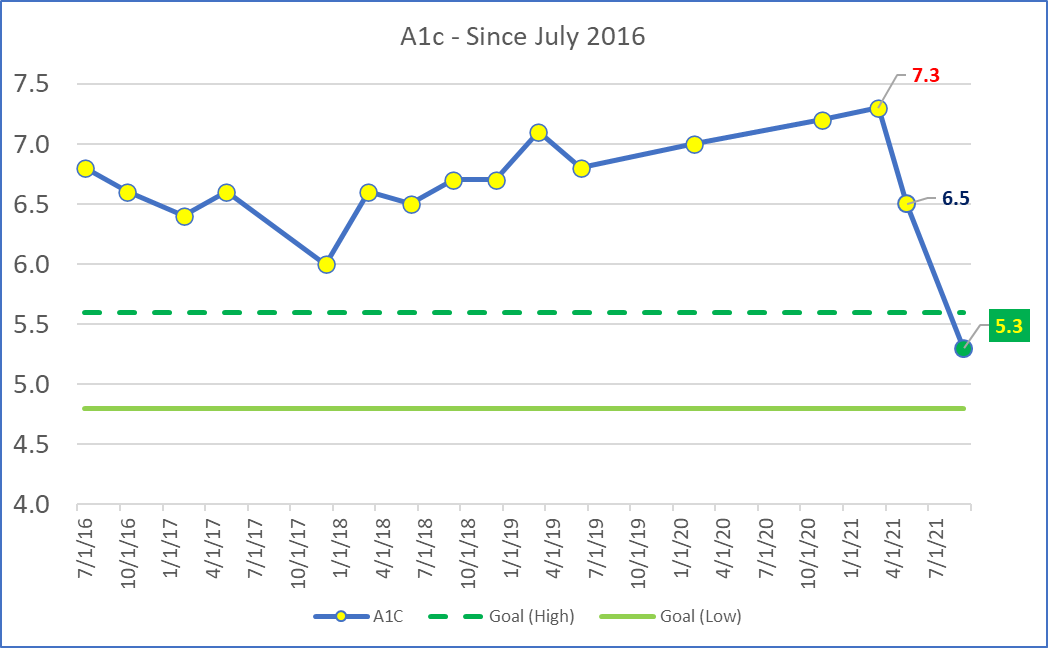 In September, my A1c was down to 5.3% Anything under 6.0% is considered to be in the green, much better diabetic control and lower risk of adverse side effects.